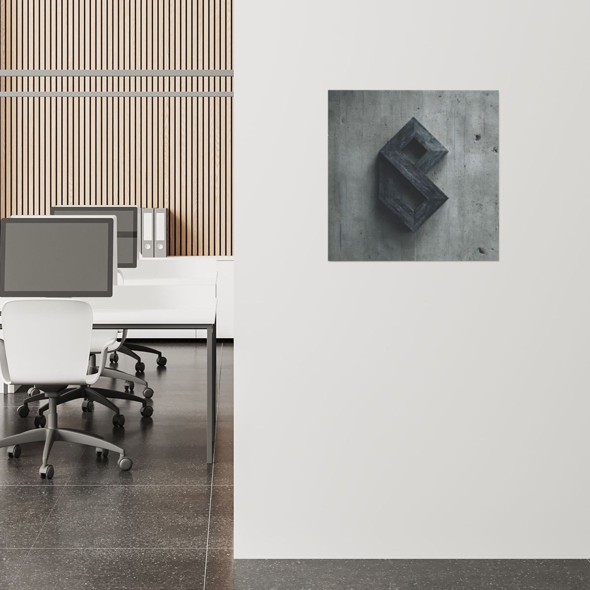 This industrial-style 3D geometric wall art canvas features a bold letter-like structure in dark gray tones against a textured concrete background. The three-dimensional effect gives the artwork a sculptural quality, combining abstract geometry with a raw industrial aesthetic. It is minimalistic yet striking, making it an excellent choice for modern and stylish interiors.